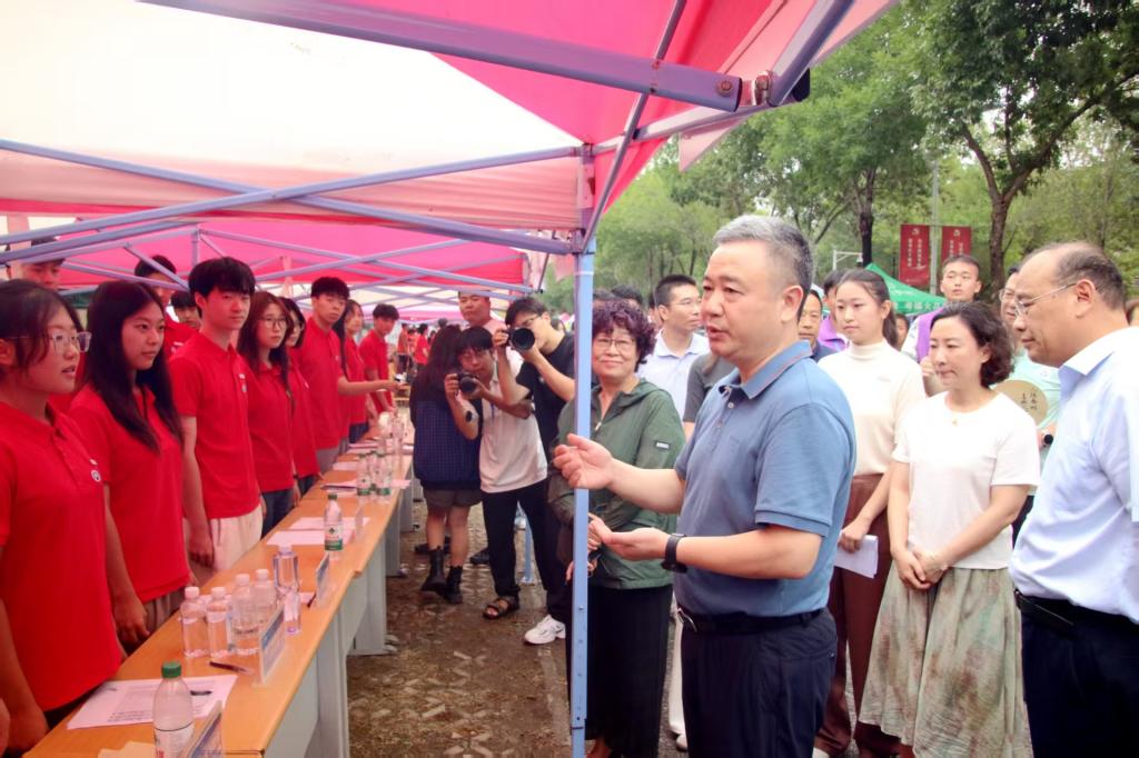 迎新现场指导工作并与新同学亲切交流。报到现场简洁顺畅,秩序井然。